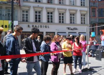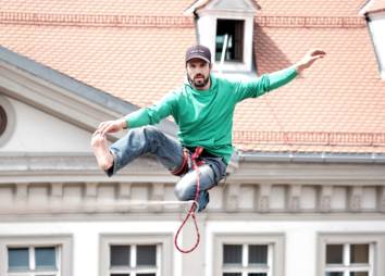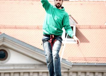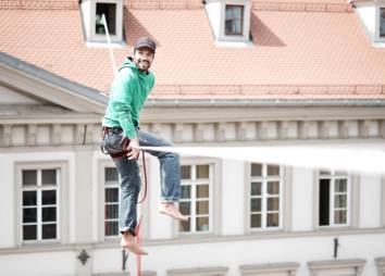 Das Motto des Aktionsbündnisses - "Was, wenn du fällst?" - war an diesem Tag Programm. Während Slackliner Christian Waldner in schwindelerregender Höhe erfolgreich die Maria-Theresien-Straße überquerte, konnten Passant*innen selbst ihr Slackline-Talent unter Beweis stellen. Drei unterschiedlich schwierige Wege führten dabei zum gleichen Ziel, die zu gehende Route wurde durch Drehen des Glücksrades bestimmt. Beide Programmpunkte machten darauf aufmerksam, dass der Balanceakt zwischen Schule und Beruf risikohaft ist und oft auch mit Glück zu tun hat.