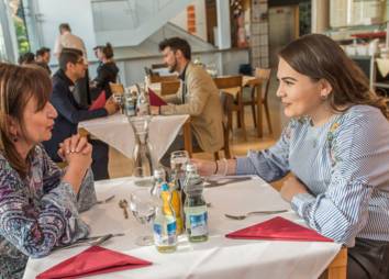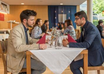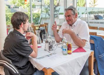 Im ersten Teil der Veranstaltung gab es ein gemeinsames Essen von ausgewählten Entscheidungsträger*innen mit arbeitssuchenden jungen Menschen. Die Idee war, Erstere in direkten Kontakt mit jenen Menschen zu bringen, die von ihren arbeitsmarkt- und firmenpolitischen Entscheidungen betroffen sind. Auf Augenhöhe und im direkten persönlichen Gespräch konnten sie sich zu Themen rund um den Einstieg in die Berufswelt austauschen.