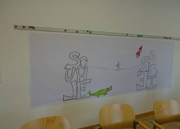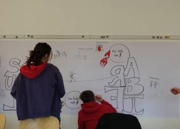 Unsere Gesellschaft durchläuft derzeit multiple Krisen und junge Menschen sind im Besonderen davon betroffen - unter anderem, weil ihnen dadurch der Berufseinstieg erschwert wird. Betroffene Jugendliche und junge Erwachsene haben das Thema Jugendarbeitslosigkeit im Rahmen eines Graphic Recording-Workshops mit Nicolas Bleck beleuchtet. Gemeinsam wurden ihre Erfahrungen, Hürden und Ressourcen beim Berufseinstieg diskutiert und in Bilder übersetzt. Dabei entstand ein drei Meter langes Banner, das die Jugendlichen mit eigenen Sketch Notes befüllten.