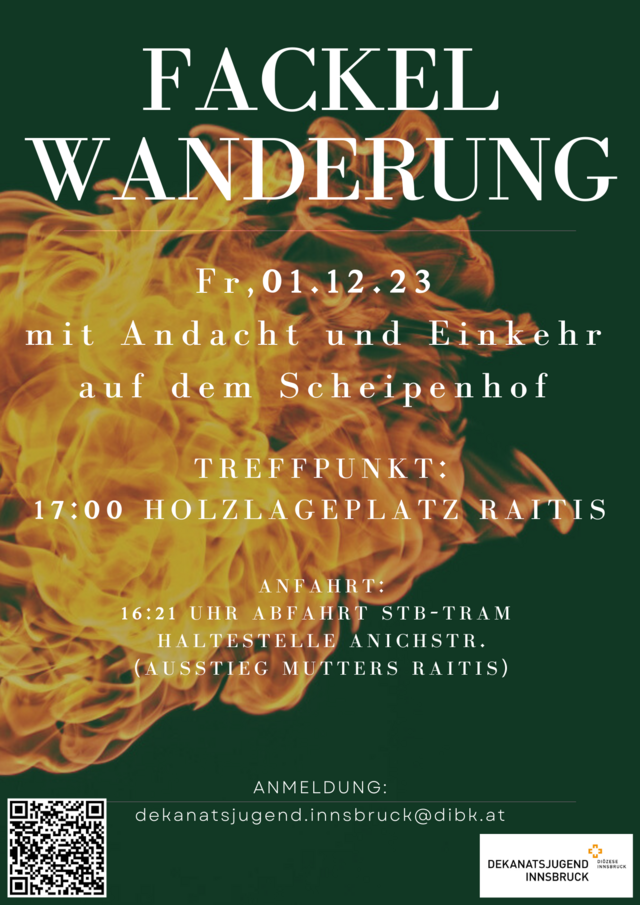- Fr 06.12.24, 17:00 Uhr Fackelwanderung auf den Scheipenhof in Mutters (Treffpunkt: Holzlagerplatz Raitis/Parkplatz zum Scheipenhof)