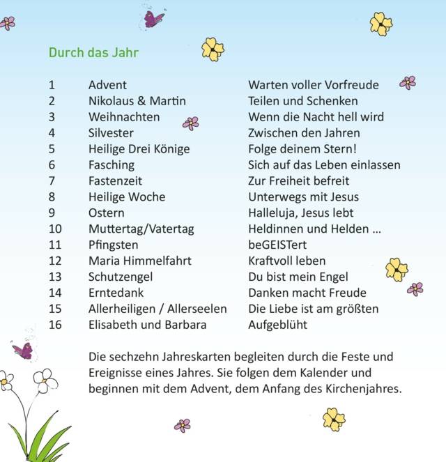 - Sie lädt ein, wesentliche Themen und Feste aus christlicher Sicht zu vertiefen, sich den Fragen und Gedanken der Kinder zu stellen und gemeinsam darüber nachzusinnen, was "dahintersteckt”.