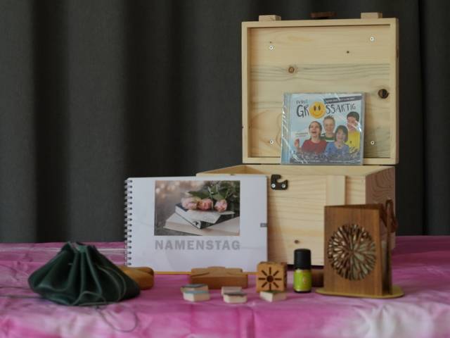Die Box enthält Impulse und Materialien, die als Anregung genommen werden können. Es wird dazu eingeladen aus den Impulsen etwas Eigenes zu machen, dort hineinspüren, was gerade wichtig ist.