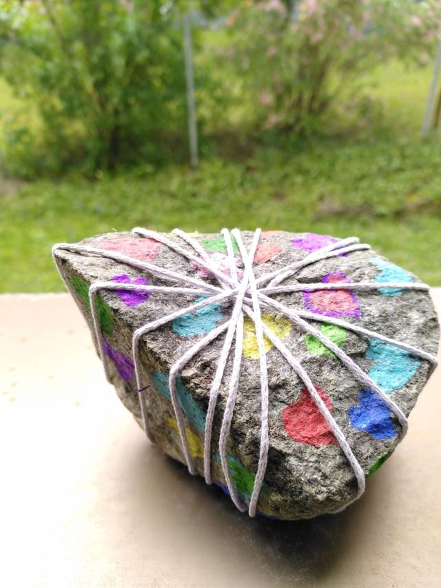 Als Zeichen des Miteinanders, dass wir alle für mehr Herz in unserer Umgebung eintreten wollen, wird ein Netz um den Stein gelegt. Immer dann, wenn es Schwierigkeiten im guten Miteinander in der Klasse gibt, kann der Stein Anregung sein um zu überlegen, wie die Situation verbessert werden kann.